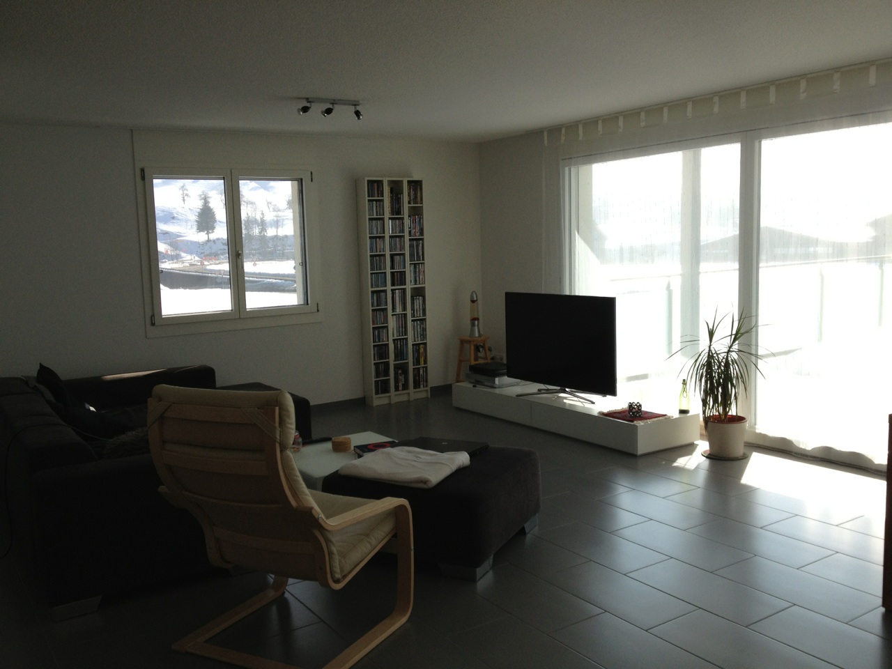 Der grosszügige und moderne Wohnraum ist mit keramischen Bodenplatten,